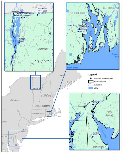 High-frequency spatially extensive data generated by our sensor network for a suite of watersheds with different land uses and landcover extending along a north-south gradient (VT-RI-DE) will allow us to examine natural and social science hypotheses that would be difficult to address with discrete water quality data such as: